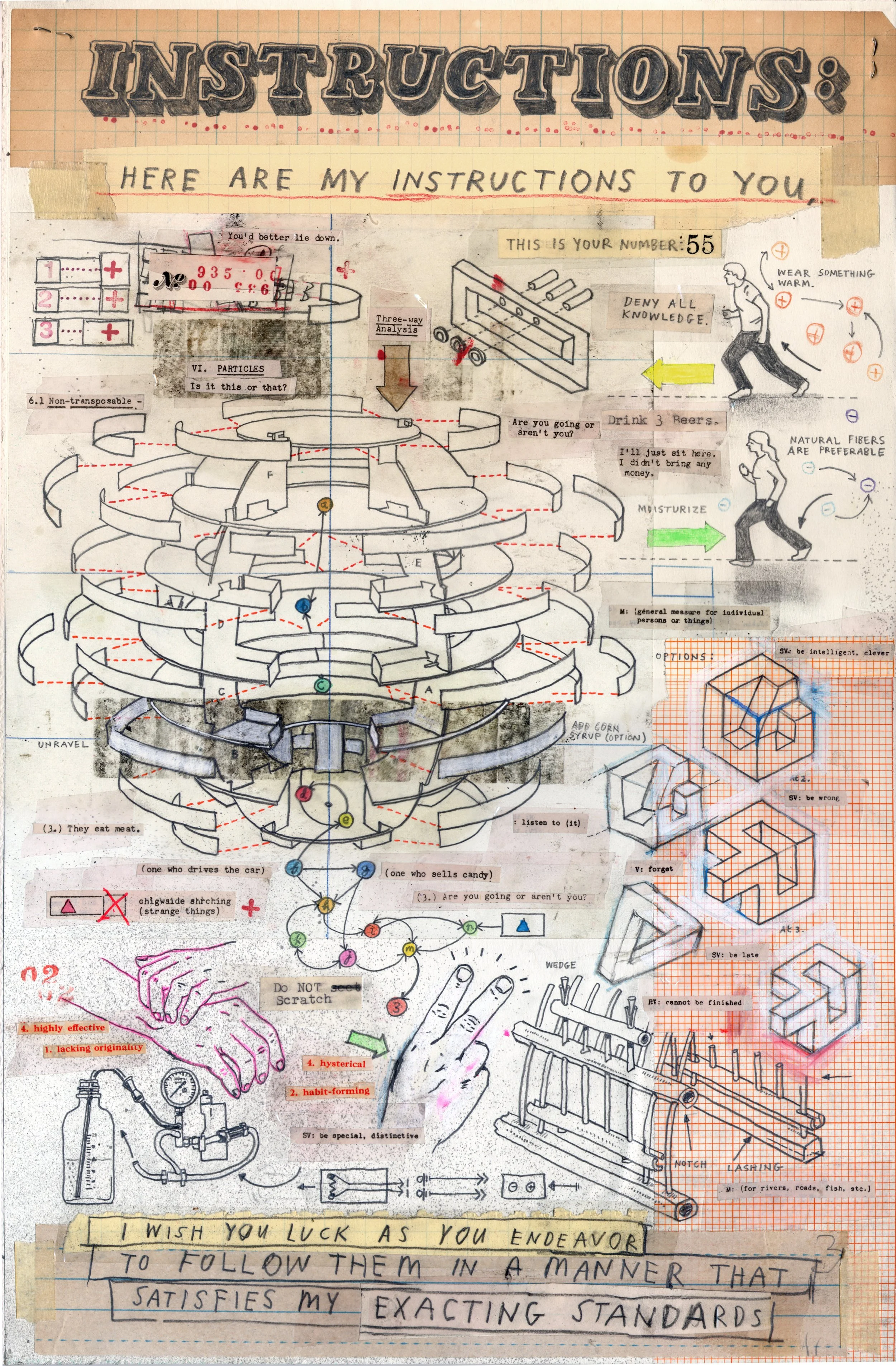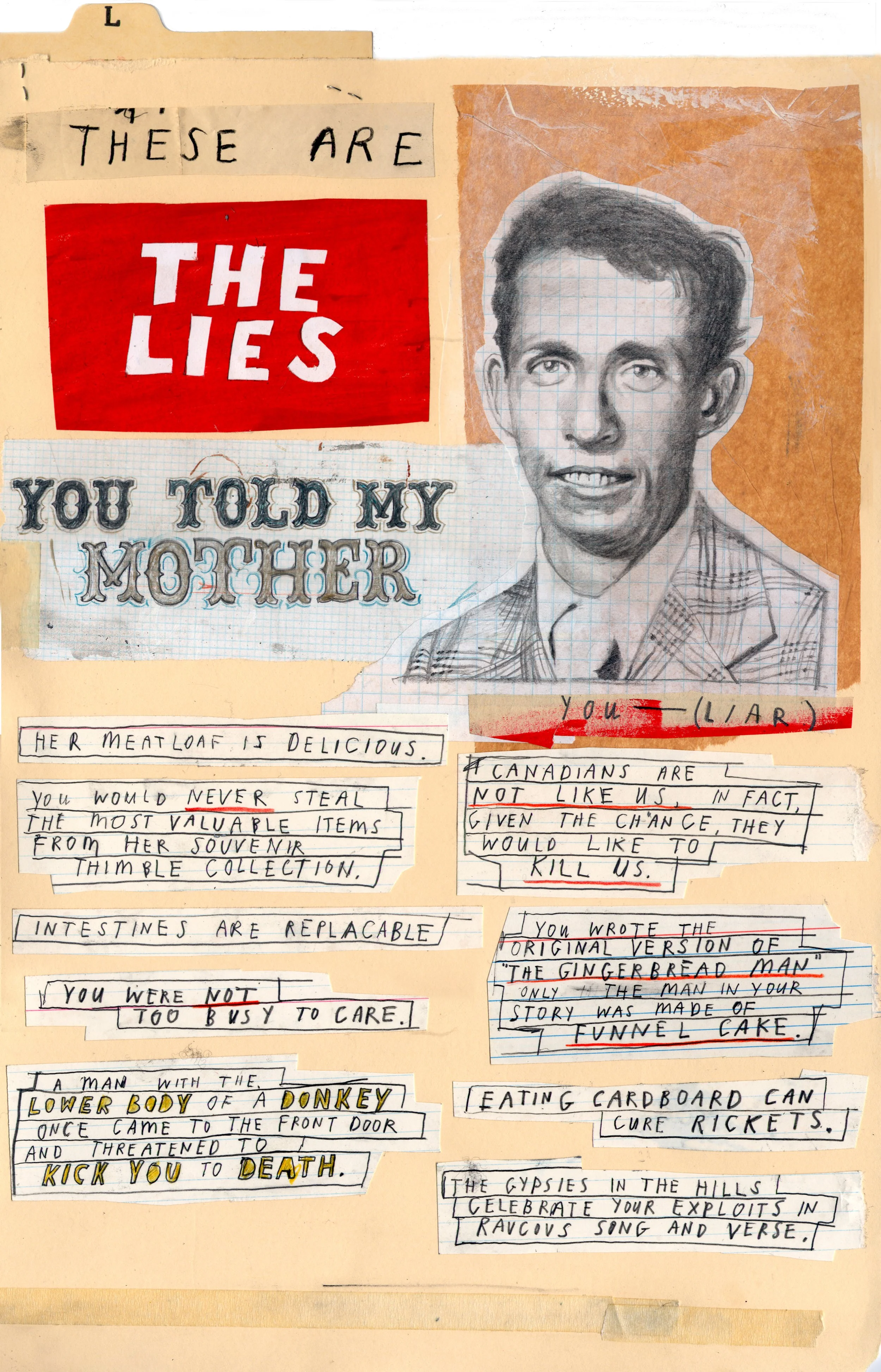 I also do larger drawings on wood panels and canvas and those tend to be a lot freer, I’ll do the collagey parts first on those. I’ll get the canvas and mess it up with lots of collage and paint, then after that, I’ll attach drawings and words - those always feel much freer and more fluid. I’ll almost never have an idea when I start those bigger ones.