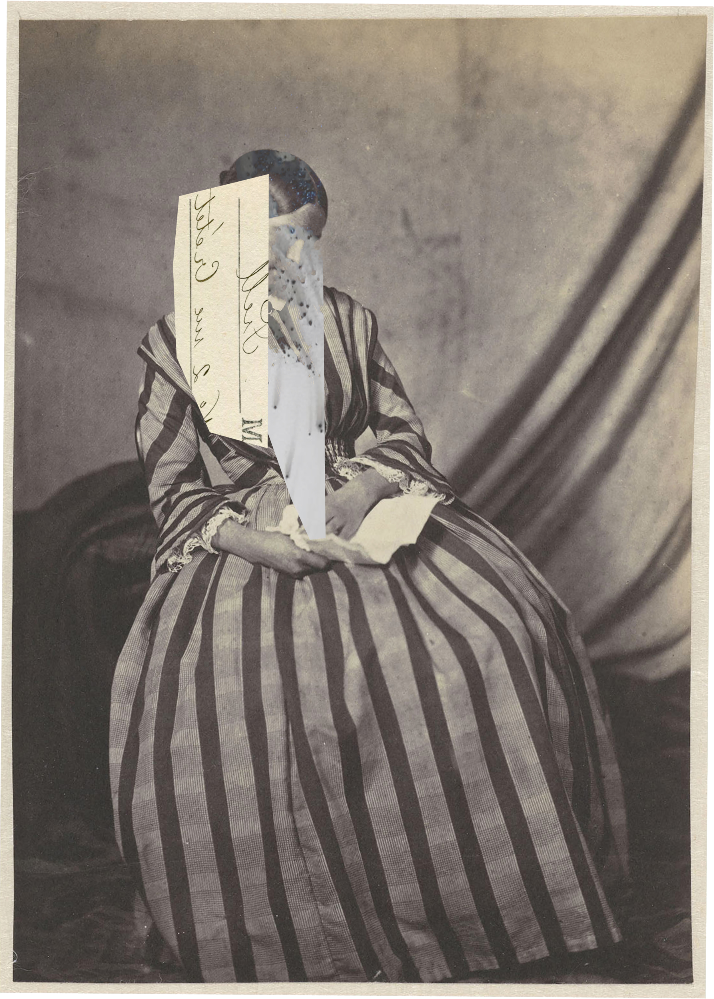 What would you say your objective is when you’re working with the old photographs? There seems to be an element of disruption going on where you have the purity of the original imagery but then a face gets covered over. What’s your thinking behind that?