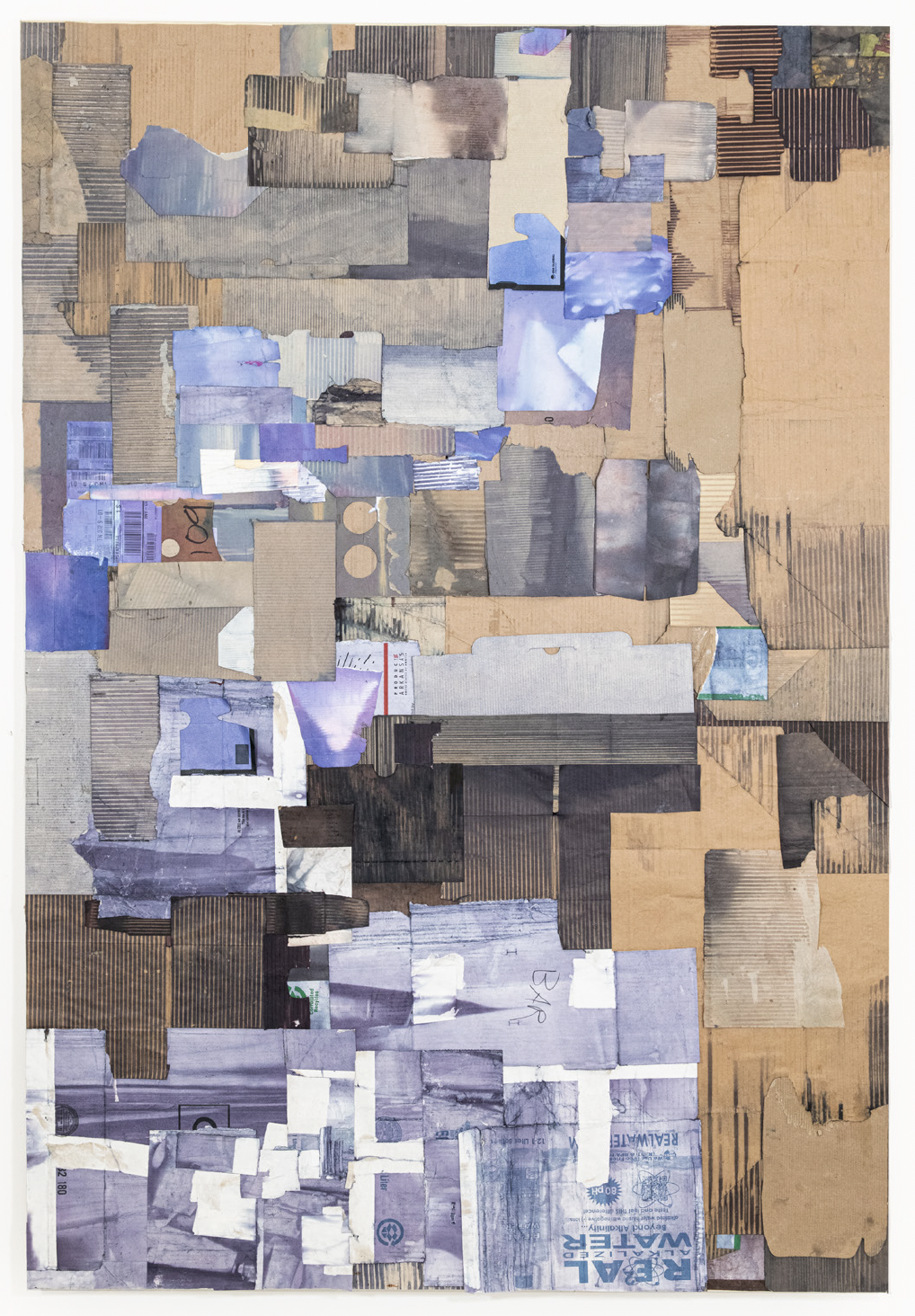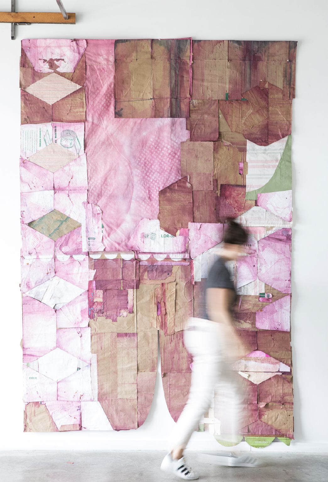 I was making work really small a few years ago, but then they just started expanding to bigger and bigger works. I usually piece the work out on the floor and then glue it together. I dye the pieces, dry them under big Masonite boards to keep them flat. There’s so much visual and textural information just in one little bit of cardboard. My job when I’m making a painting is to either unify that or create a singular prompt or something out of those disparate parts, like a shotgun wedding.