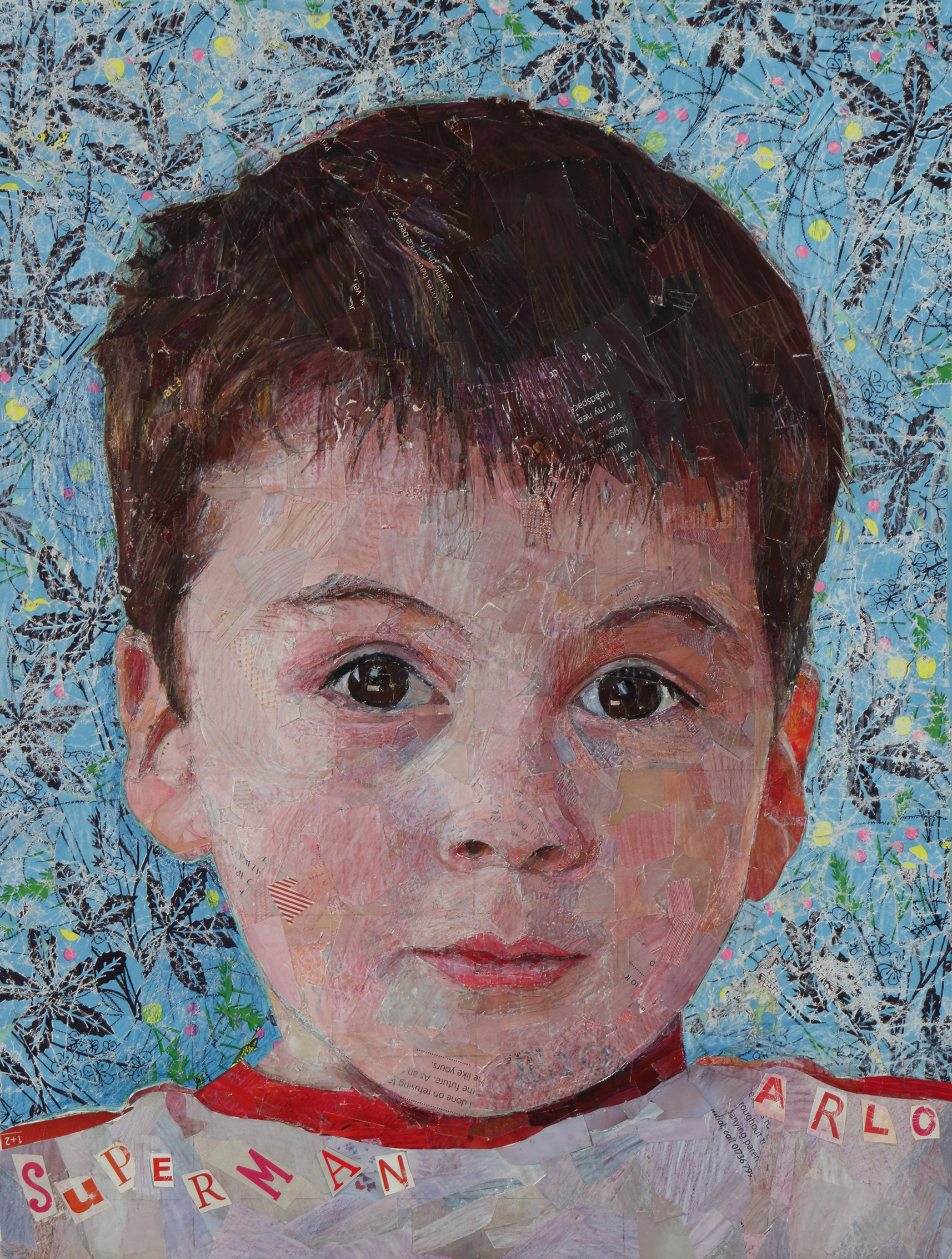 are what makes the portrait interesting, they are the surprise element that you can’t possibly pre-plan. The background is always important. With ‘Ken’ I was experimenting with having no background, so there’s just white canvas. I realised afterwards how important the background is. Because it’s a foil to the face, and completely made up. It’s nothing to do with what was there in the photographic reference. A child I recently made a collage of, was young, and he was football mad, so everything was about circles and footballs –it’s about having some fun with it.