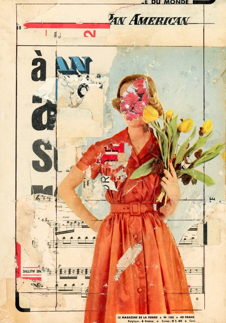 I found the original picture of a Russian pianist in a French Magazine called Paris Match. I don’t remember her name, nor the date of the picture as I often rip things and put them in folders or do stacks. I added many typographies on her dress from old newspapers and few contemporary elements to make contrast and a kind of distortion.