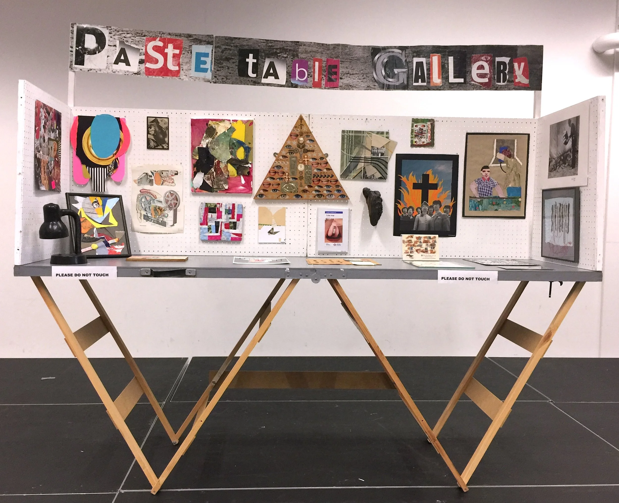 I started Paste Table Gallery in 2012 as I saw a need for a gallery specialising in cut and paste. There did not appear to be such a gallery. I did not have the resources to open a fixed space with all the attending costs and commitment of time needed to run a permanent venue. I have been a habitué of boot fairs for many years and so the idea of a portable set up was appealing. The pasting table was an obvious choice it folds neatly and can be stored easily. Then the notion of a mini white cube came to me, hence the white pegboard walls and the table painted in a typical gallery grey.